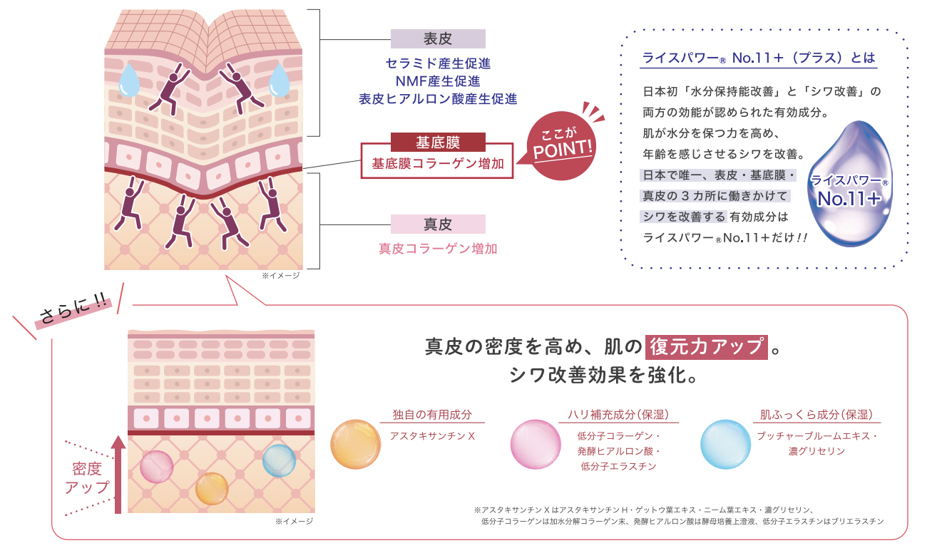 「ライスパワー®No.11+」が表皮・真皮・基底膜まで効いて徹底的にシワ改善。